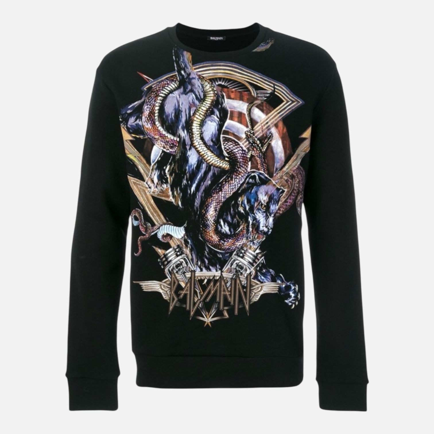 Ce sweat-shirt Balmain est un incontournable de votre garde-robe. Confectionné en 100 % coton, il est disponible en noir. Il arbore un logo panthère noir imprimé sur le devant, des zips sur les côtés et des manches longues. Sa coupe confortable vous permettra de vous sentir à la mode où que vous alliez.