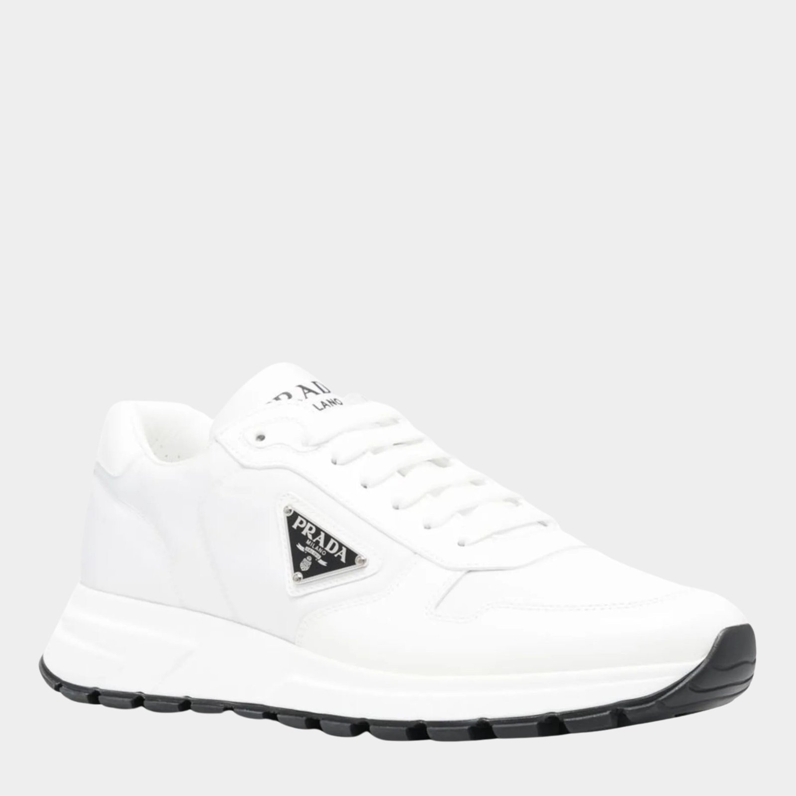 Baskets Prada en cuir noir fabriquées en Italie, avec bout rond classique, fermeture à lacets et semelle en caoutchouc. Élégantes et confortables, livrées dans leur boîte signature.