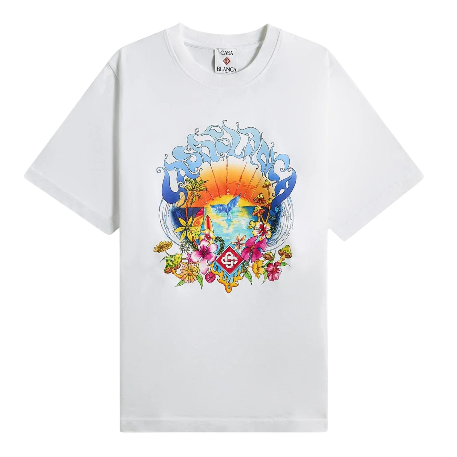 T-shirt Casablanca en 100 % coton blanc, doté d’un imprimé Surf Trip sur le devant, d’un col ras du cou côtelé et d’une coupe oversize. Un essentiel casual chic et moderne.