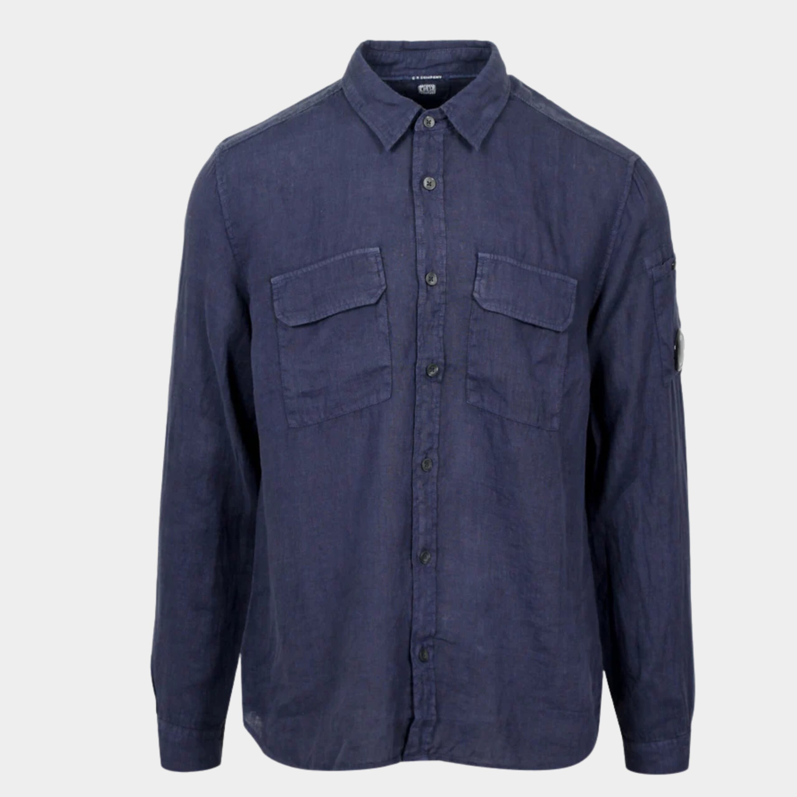 Chemise CP Company en lin bleu marine léger, dotée d’un col classique, de poches plaquées à rabat et d’un ourlet droit. Casual et raffinée, elle incarne le style urbain italien.