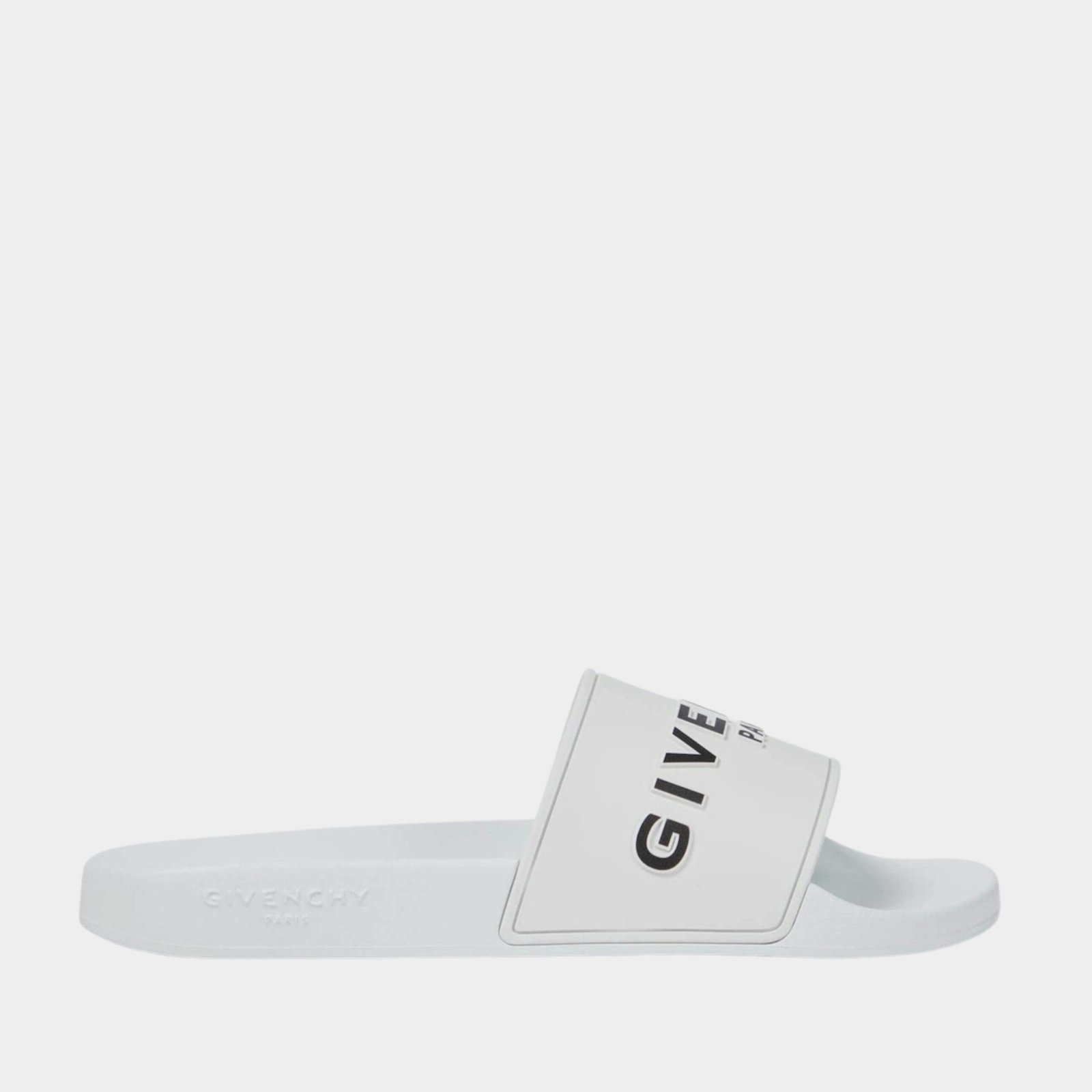 Sandales Givenchy en caoutchouc blanc avec logo embossé. Bout rond ouvert et design minimaliste, fabriquées en Italie pour un style chic et décontracté.