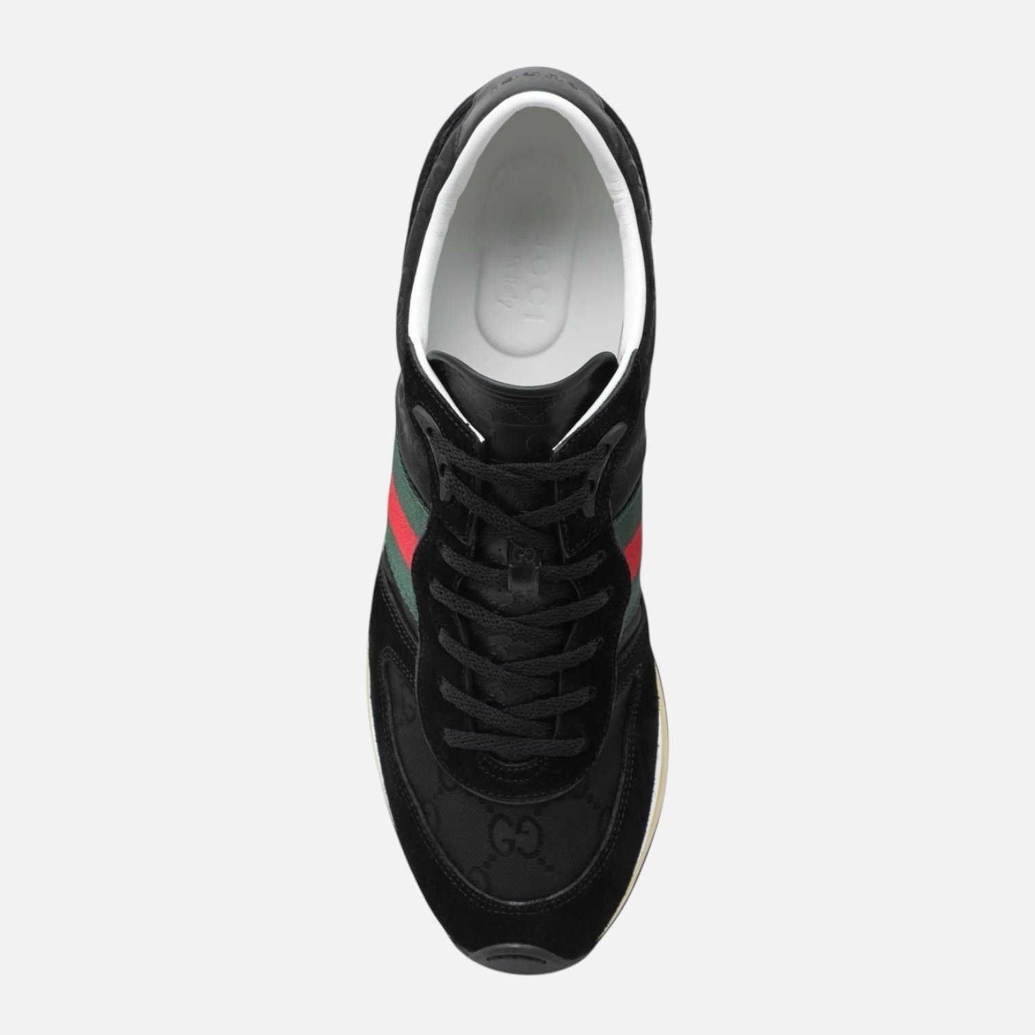 Ces baskets Gucci homme Re-motion se distinguent par leur motif GG emblématique en tissu noir, véritable signature de la Maison florentine. Les détails croisement GG sur les œillets et la célèbre bande Web rouge et verte affirment l’héritage luxury de Gucci dans chaque détail.