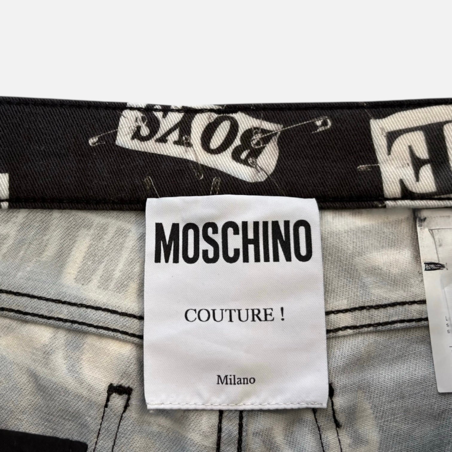 Les pièces Moschino Couture sont fabriquées en Italie, comme ce jean Safety Print. Cette fabrication italienne garantit un savoir-faire artisanal traditionnel et l'utilisation de matériaux premium, justifiant le positionnement luxe de la marque.