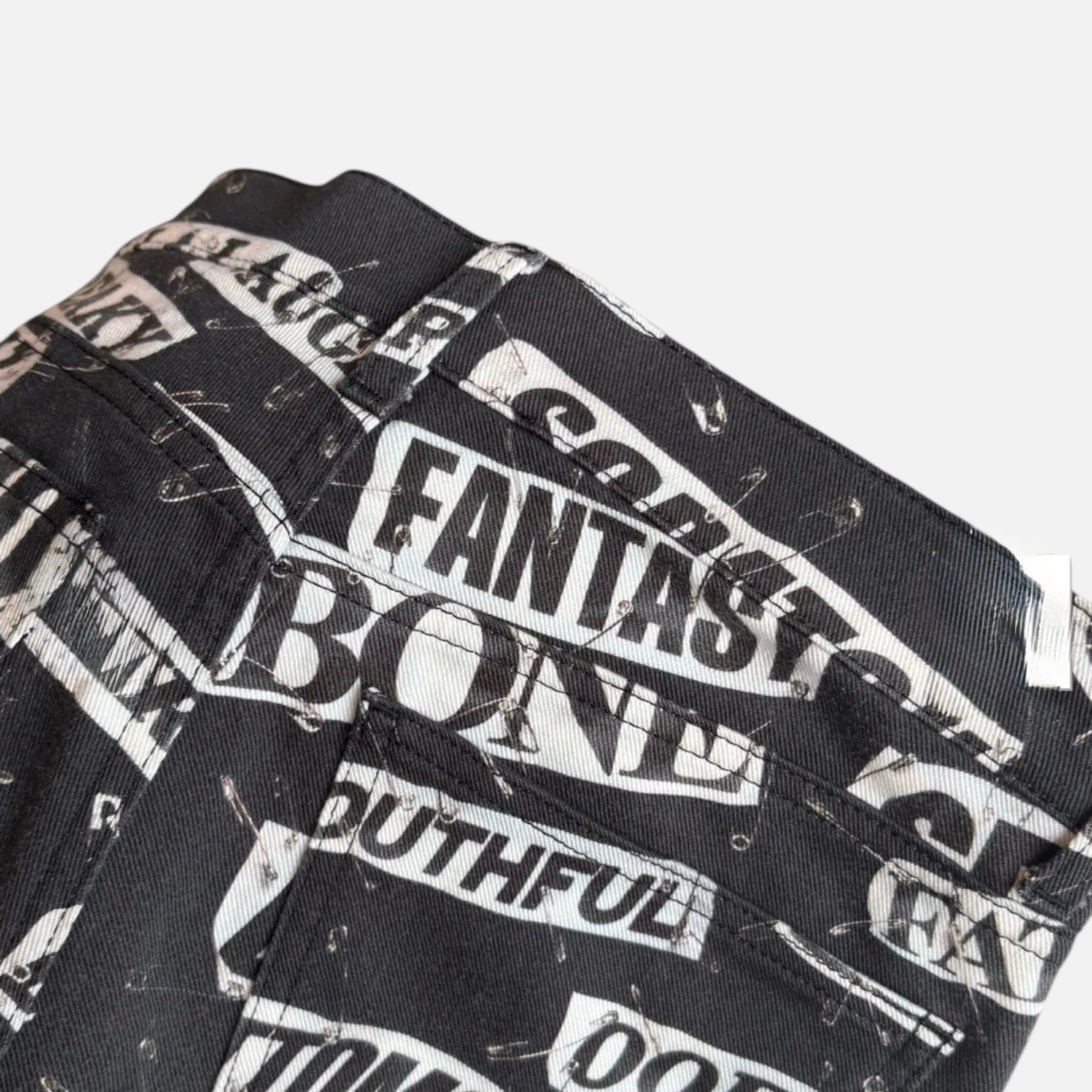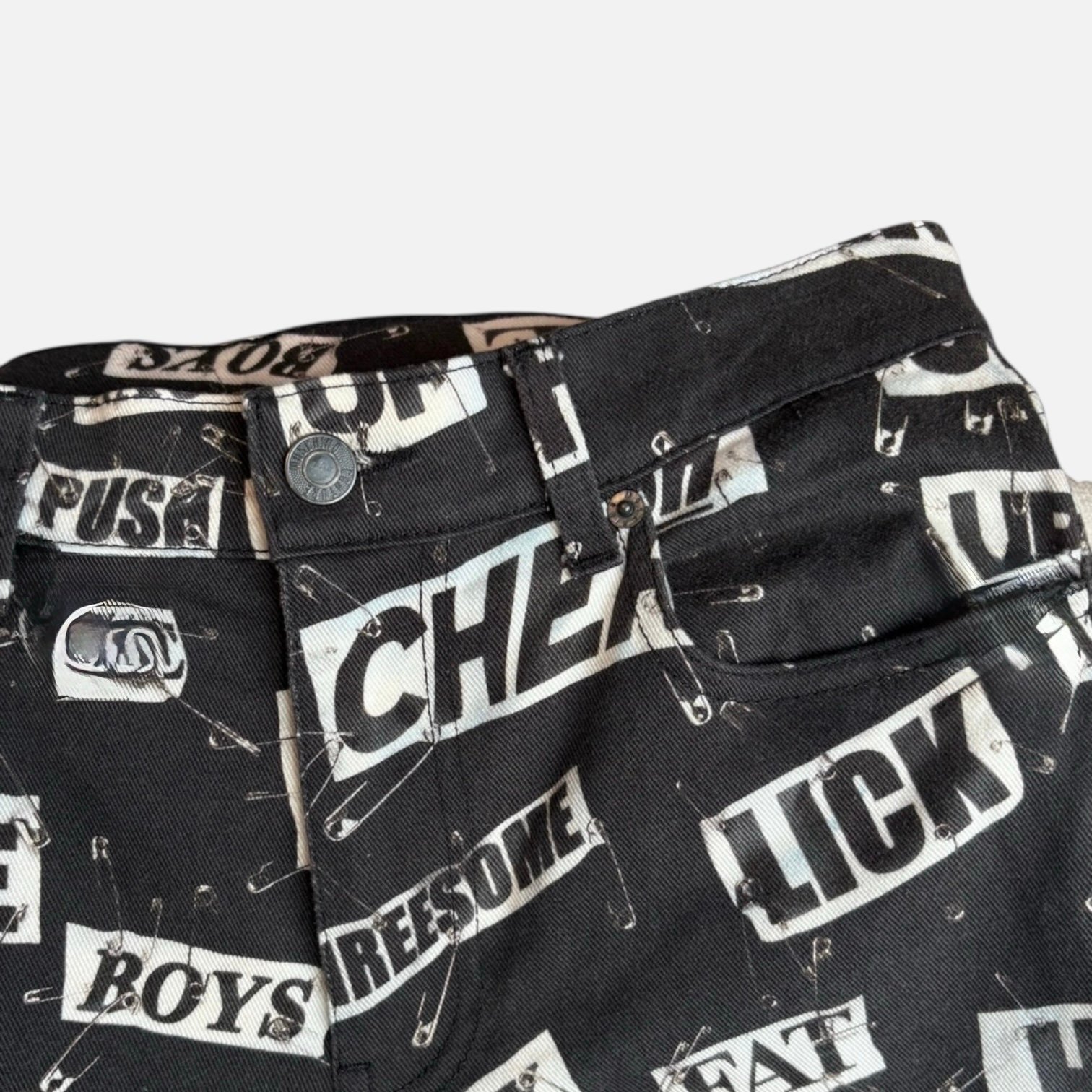 Le jean Moschino Couture Safety Print incarne l’esprit rebelle et avant-gardiste de la marque italienne. Cette pièce d’exception se distingue par son imprimé iconique d’épingles à nourrice et de lettres sur fond noir.