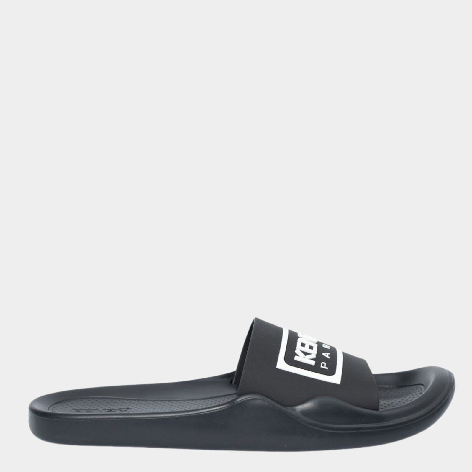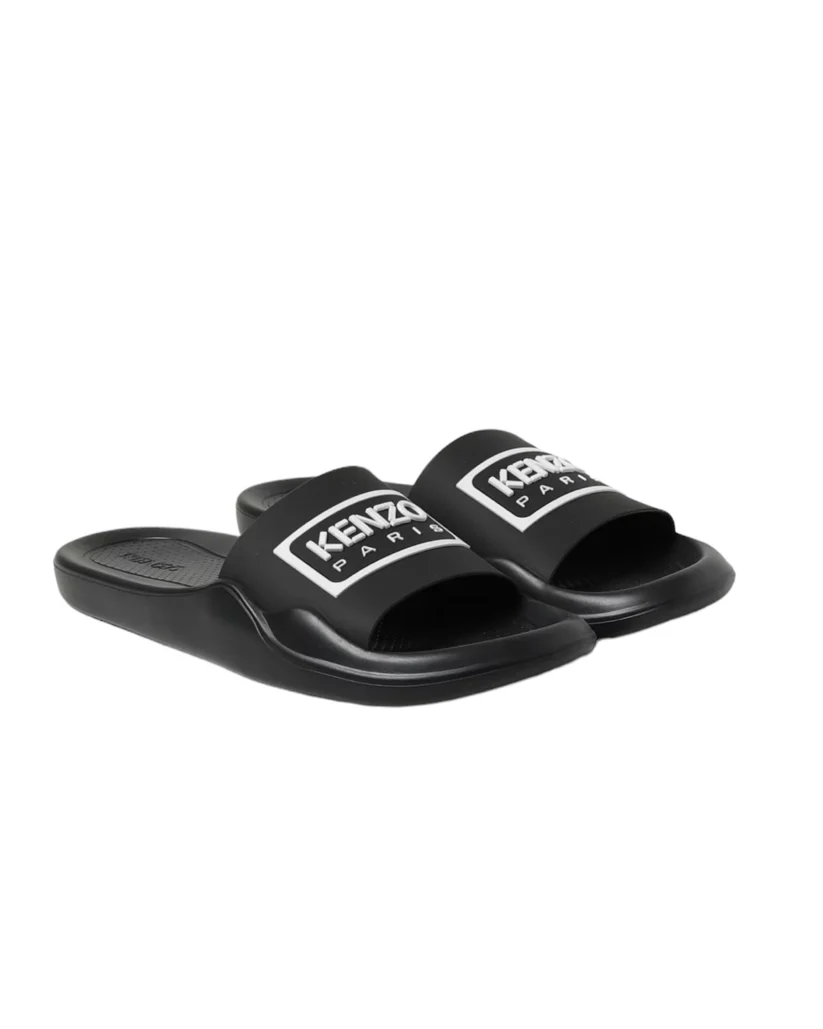 Claquettes Kenzo Pool en caoutchouc noir et blanc avec bride ornée du logo Kenzo Paris. Bout rond ouvert, semelle anatomique moulée et semelle plate confortable.