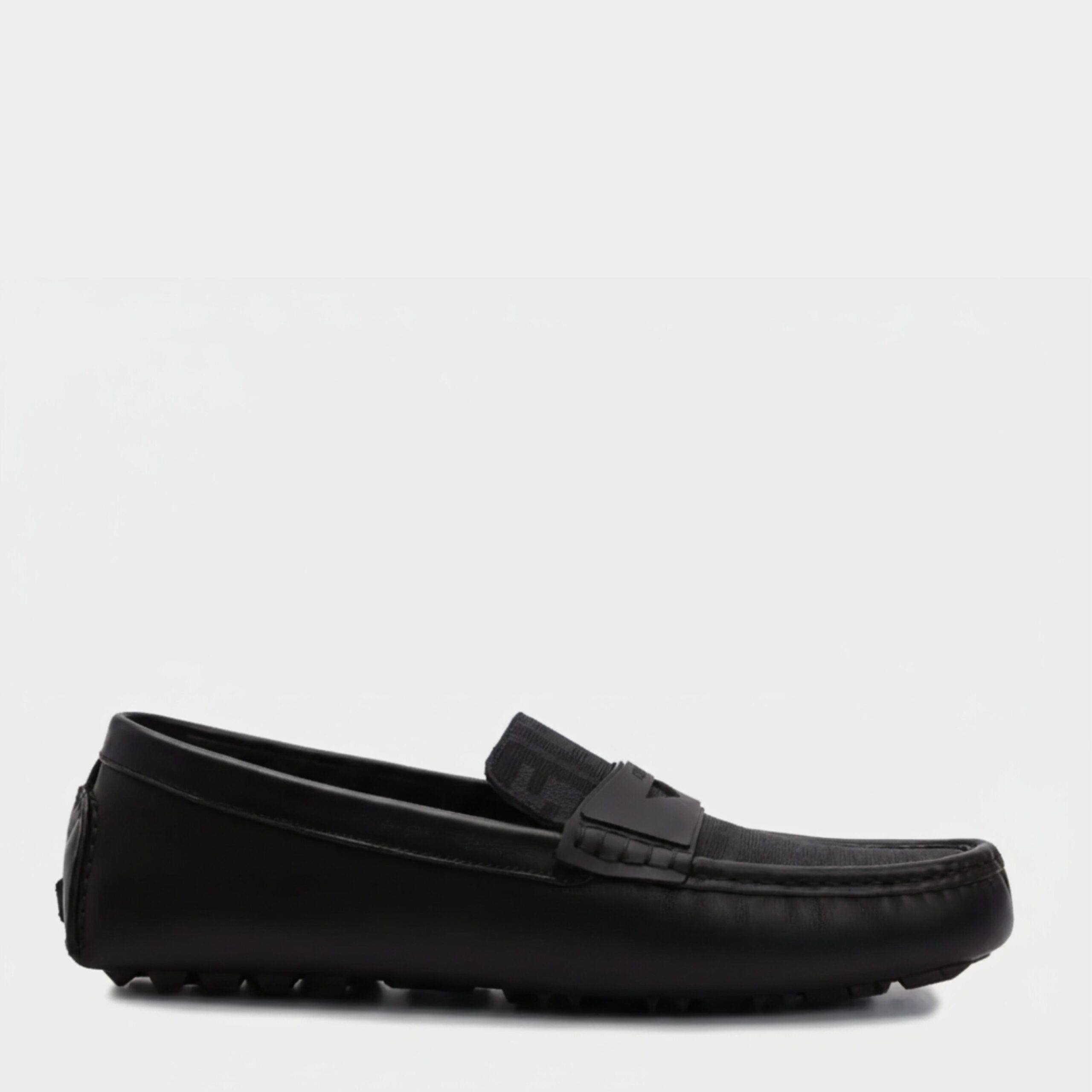 Mocassins Fendi en jacquard noir avec logo distinctif et bout en amande. Modèle à enfiler pratique avec semelle intérieure siglée, alliant luxe et confort.