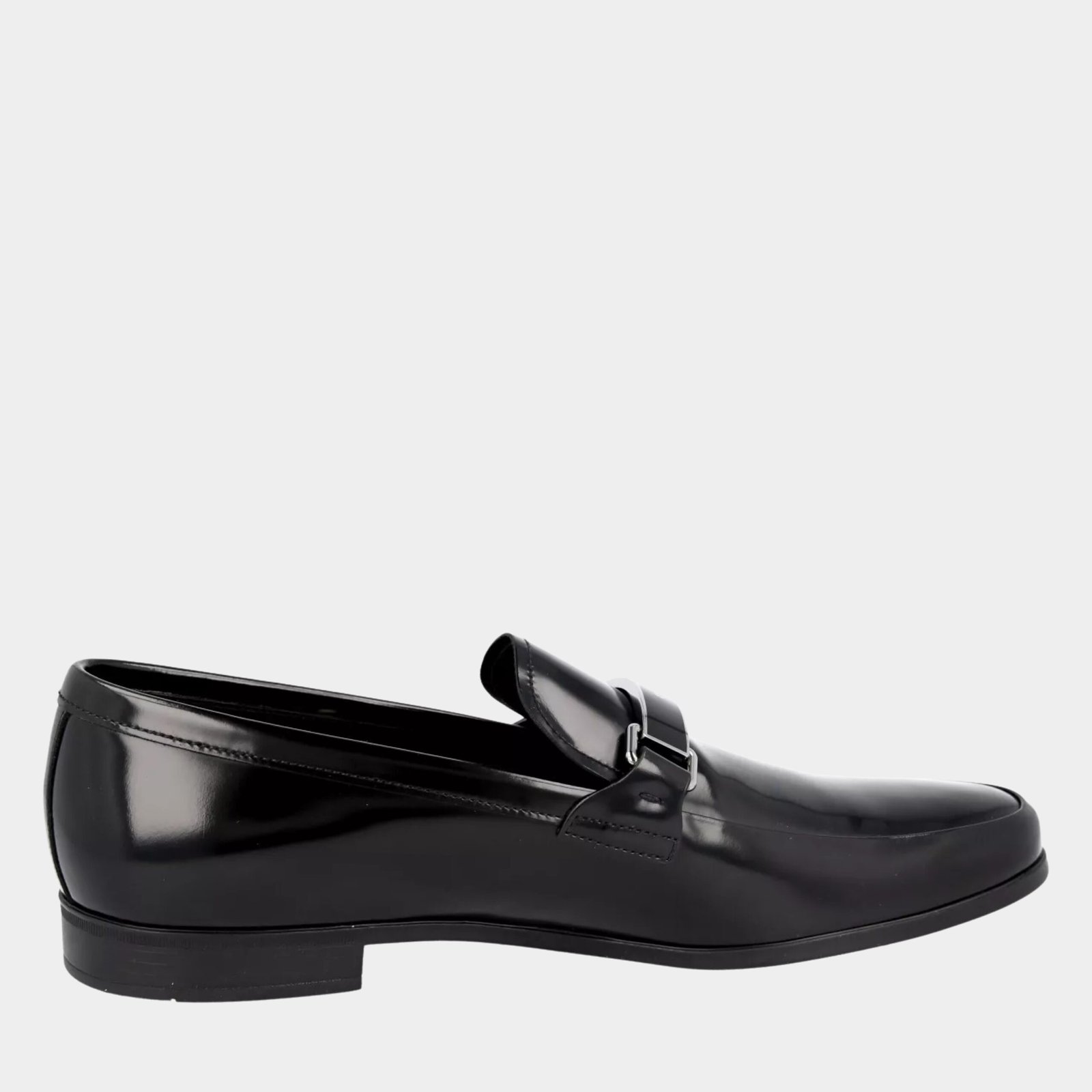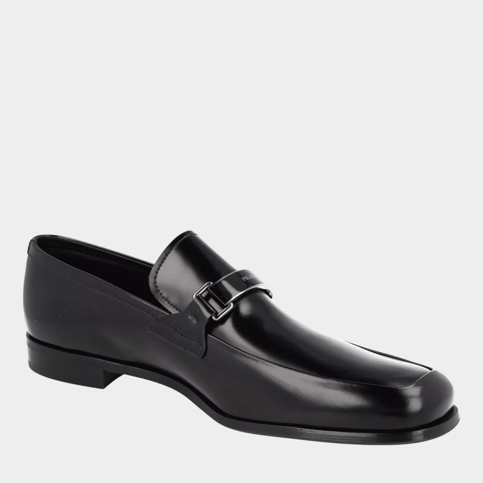 Le design est sublimé par le logo triangulaire émaillé, emblème iconique de la maison Prada, appliqué sur le dessus pour une touche distinctive et immédiatement reconnaissable. La silhouette classique du loafer est revisitée dans une version moderne, alliant simplicité des lignes et luxe subtil.
