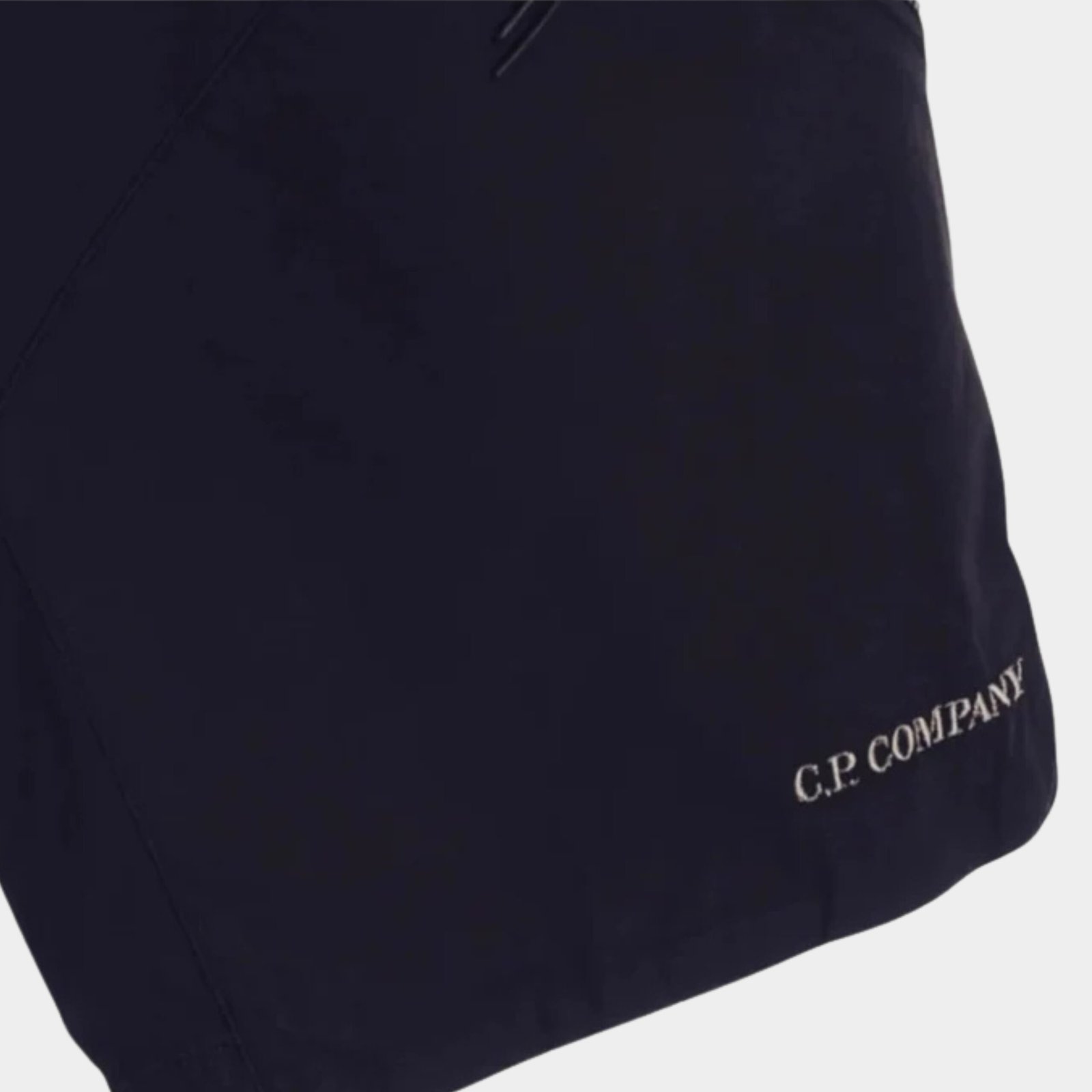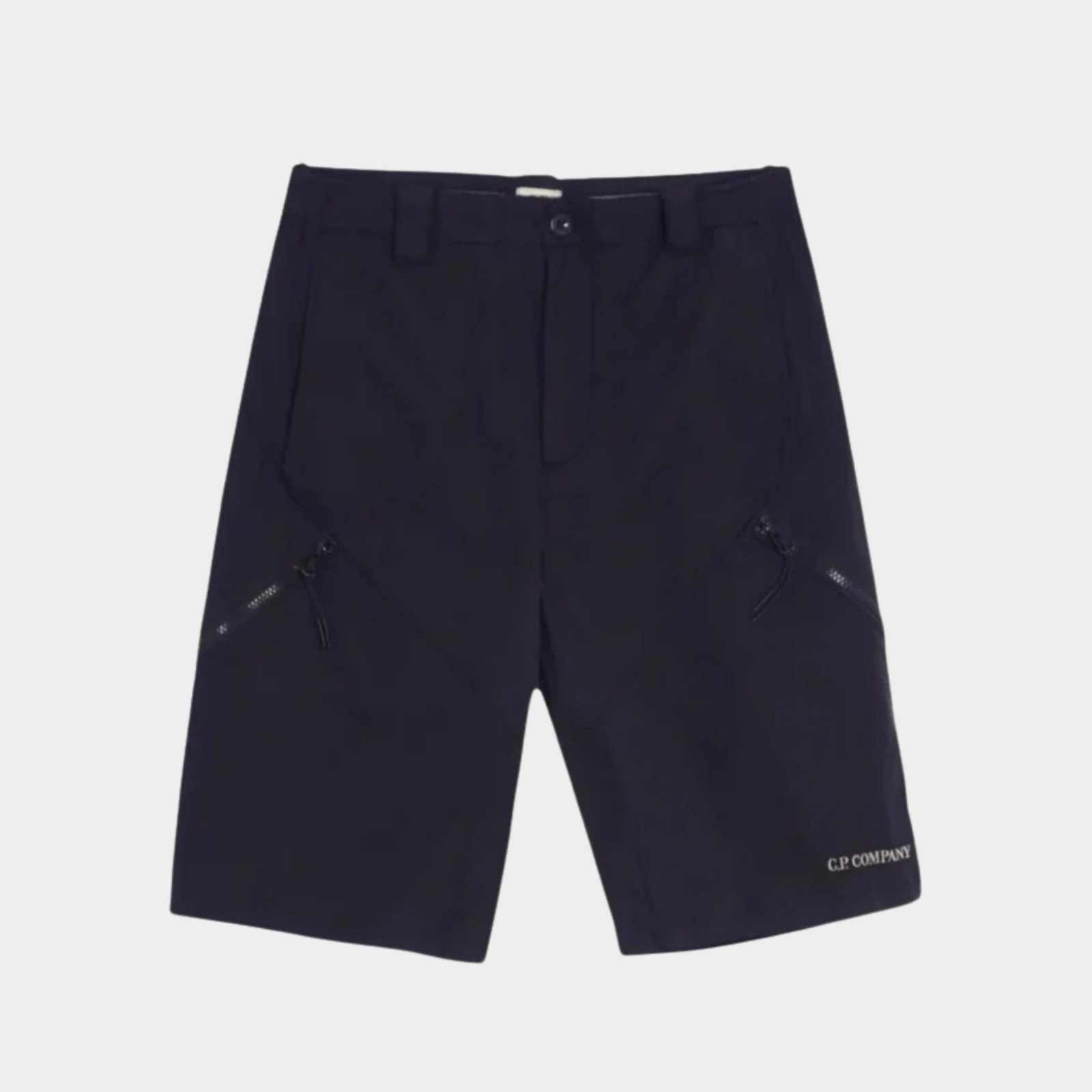 Bermuda cargo C.P. Company en coton indéchirable bleu marine, avec poches zippées diagonales, logos brodés et cousus.