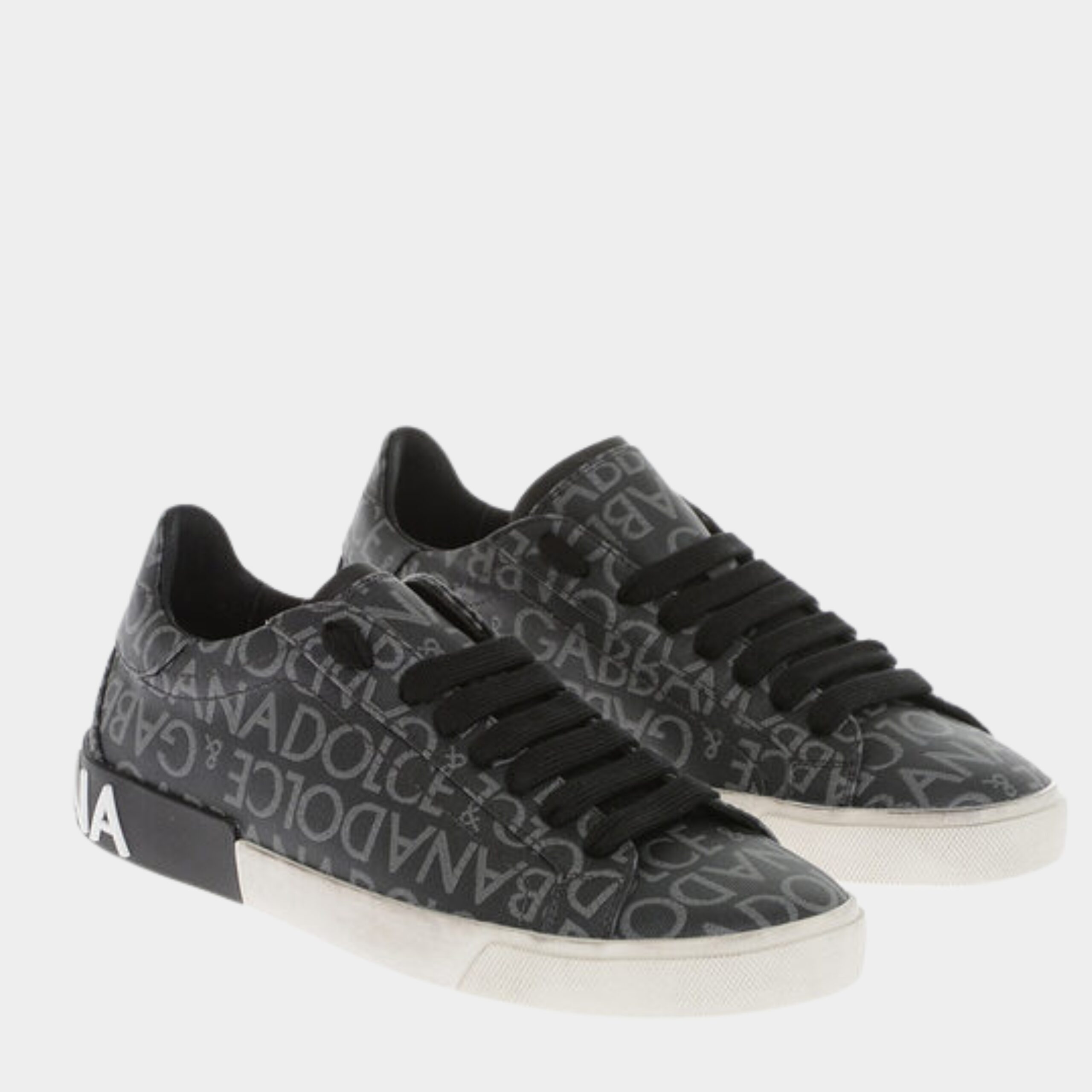 Sneakers Dolce & Gabbana en cuir noir et gris, avec fermeture à lacets et semelle en caoutchouc. Bout arrondi et talon plat pour un confort élégant et un style casual-chic.